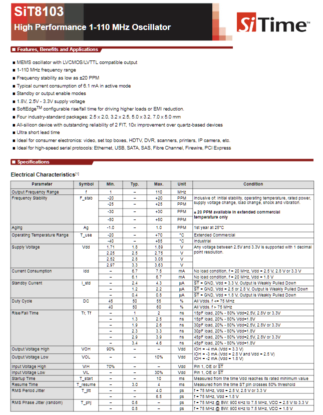 SIT8103AI-23-33E-100.00000X | MEMS OSC XO 100.0000MHZ LVCMOS | 3.3V | ±50ppm | -40°C ~ 85°C | 4 | 3225 | SiTime | SiT8103 | LVCMOS,LVTTL |